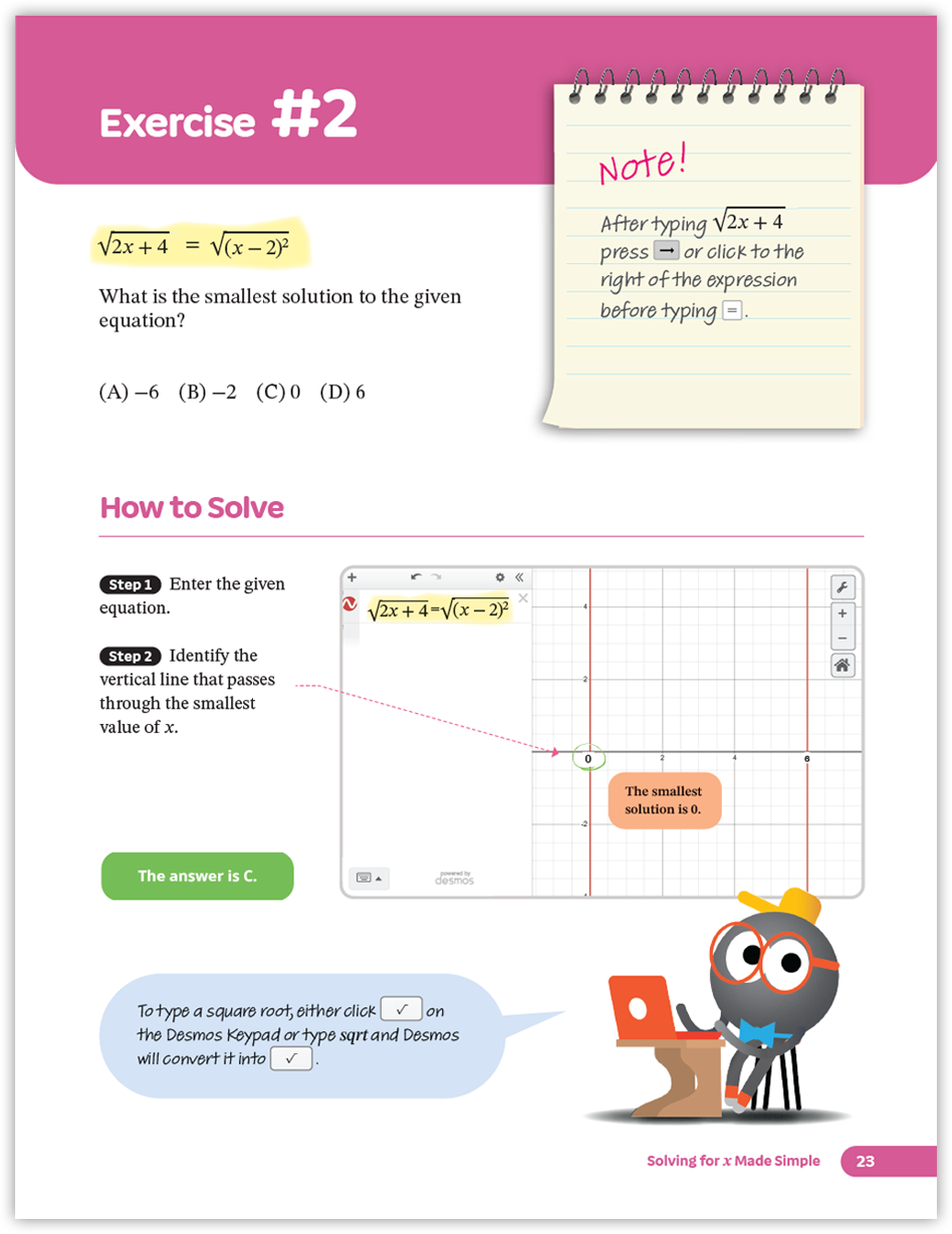 Here’s a peek inside! Each exercise walks you through a math question and shows you how to solve it on Desmos. (You can access a free online version of the calculator to practice the exercise yourself.) Each step is shown with color-coded visuals and clear tips so you can follow along and actually see the solution.